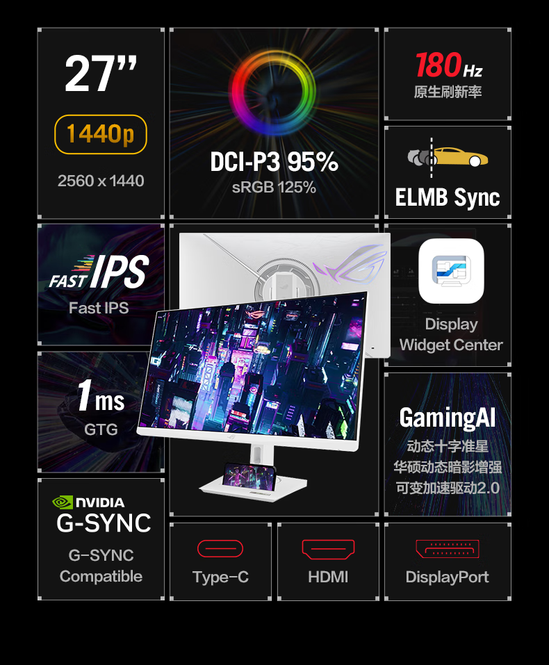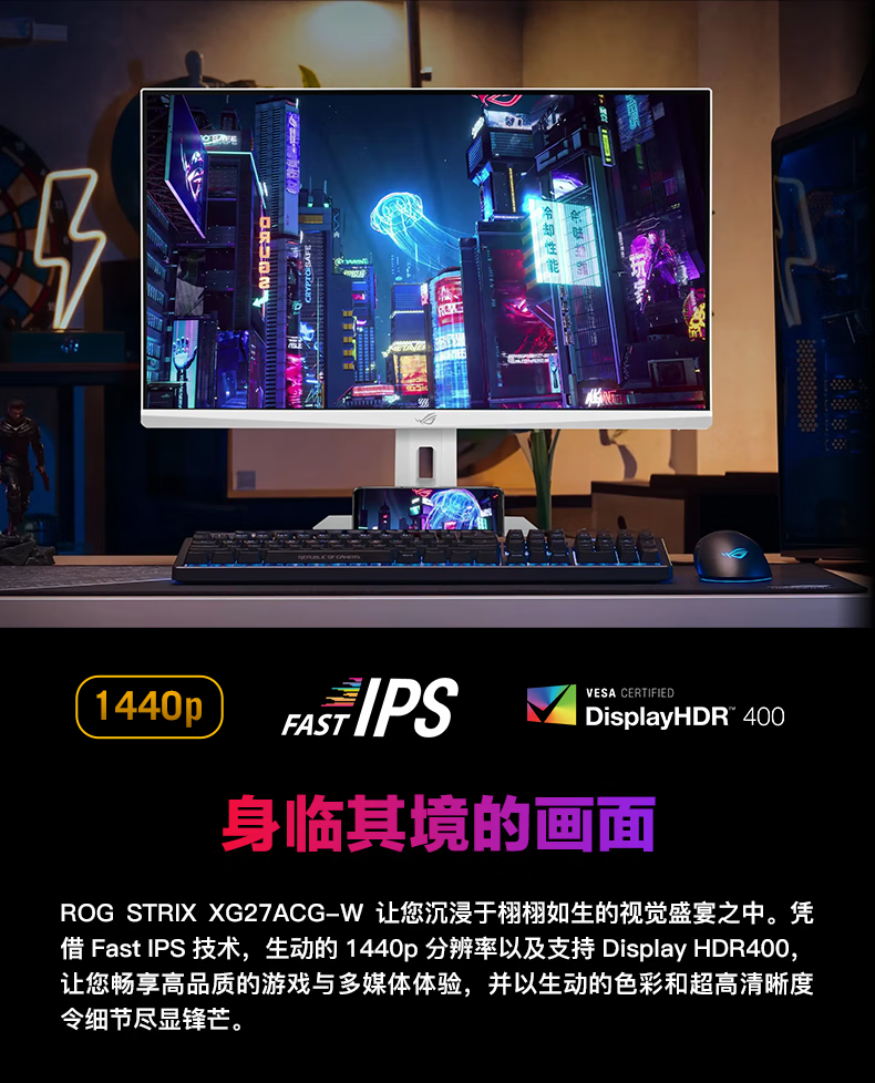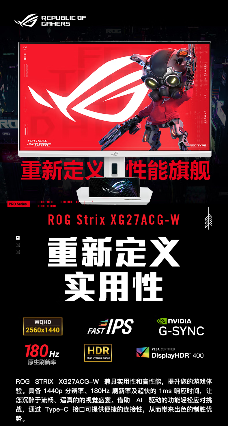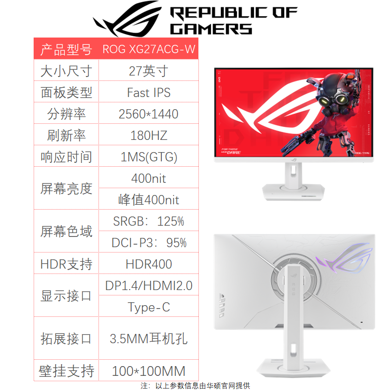 商品名称:ROG/玩家国度 XG27ACG-W 27英寸电竞2K180Hz FastIPS屏幕显示器